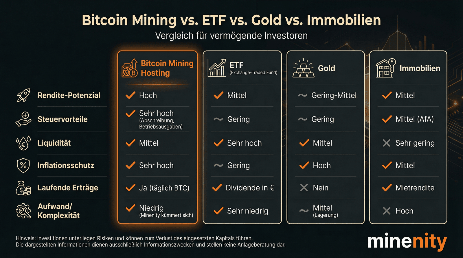 Mining-Vorteil gegenüber ETFs: Bitcoin Mining generiert laufende Erträge in Form von Bitcoin – vergleichbar mit einer Dividende, jedoch in einem Asset, das strukturell deflationär ist. Ein ETF zahlt Dividenden in Euro oder Dollar. Bitcoin Mining zahlt in Bitcoin.